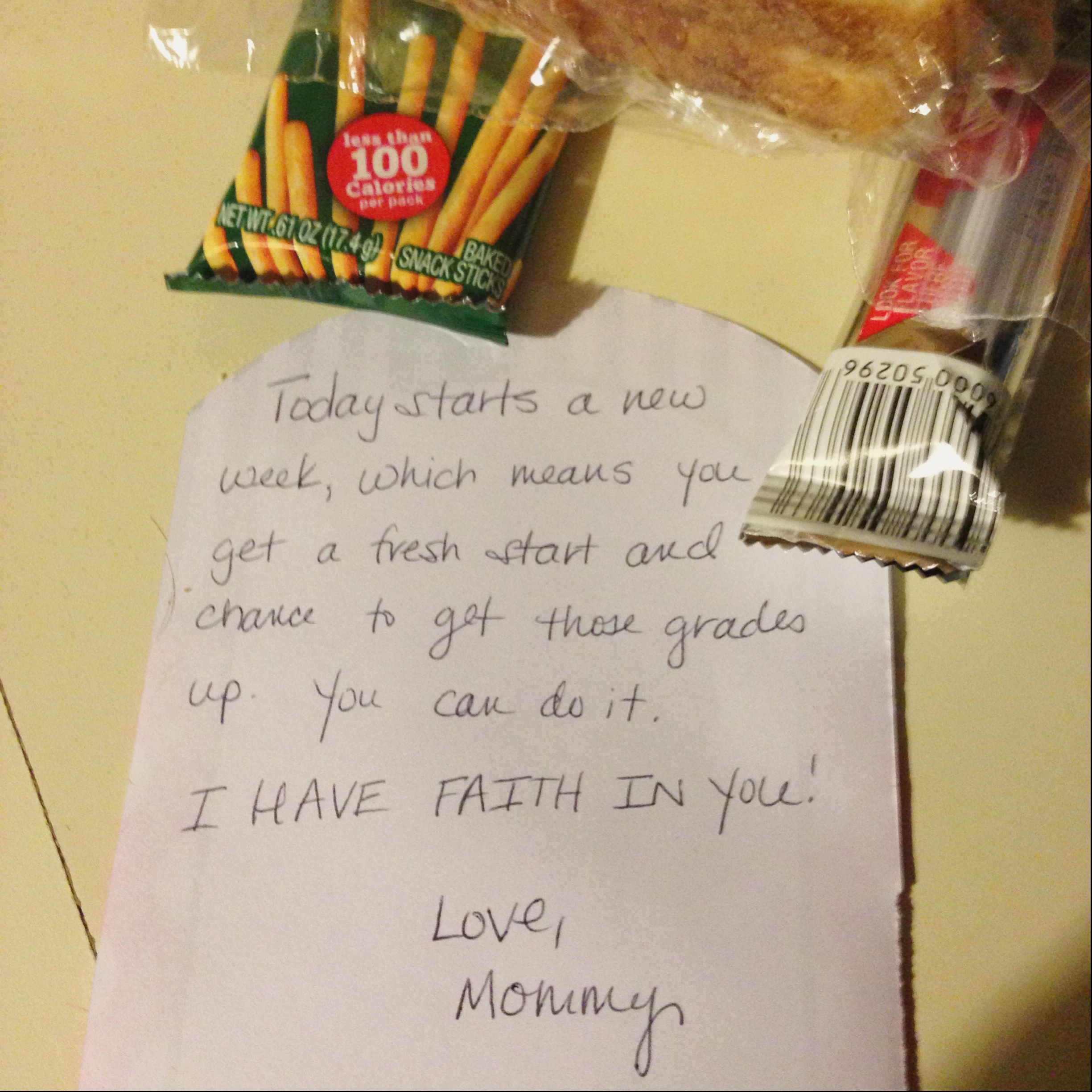 I’m sorry if my lunch box note puts added pressure on you, since you think I don’t get that either. Maybe you are right. School work just came easier to me. Truthfully, I didn’t need my parents’ pressure. I had enough of my own-the kind I put on myself. See, I mastered schoolwork in much the same way you master wrestling moves on the Xbox! I studied into the wee hours of the night, and at age 35…I still do! And I’m 35. Still trying to finish school. I just don’t want this for you. I applied to college much like you will in a few short months, and I got accepted into a few, but I couldn’t go. I had to make tough choices. Again, I don’t want this for you. So, yes. I get the pressure, but I want you to explore things, see places, do things that your parents didn’t get to do. It’s called wanting the best for our children. You’ll get it when you become a parent, too.