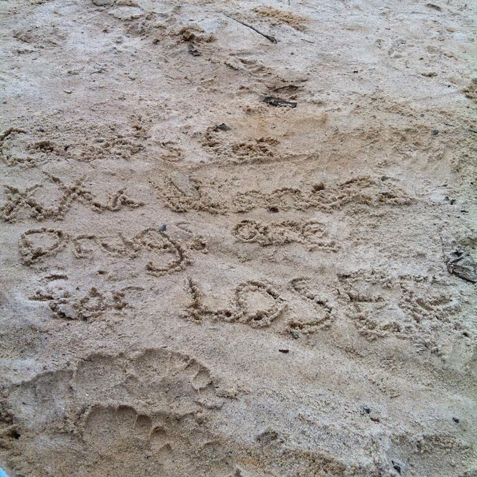 Recently at the beach, which is really a lake a block from my house, I was writing “graffiti” in the sand, consisting of Bible verses…