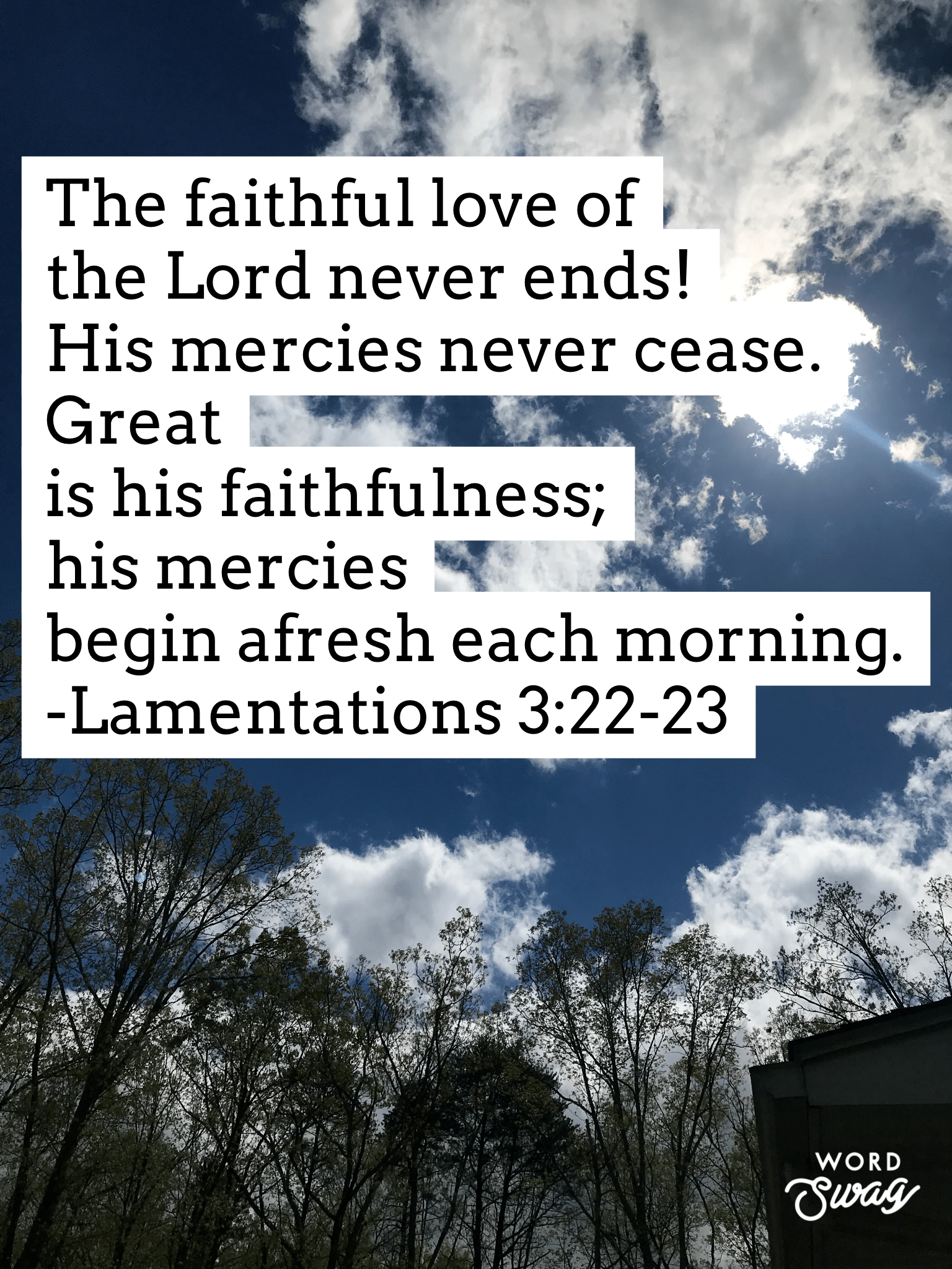 The faithful love of the Lord never ends! His mercies never cease. Great is his faithfulness; his mercies begin afresh each morning. Lamentations 3:22-23