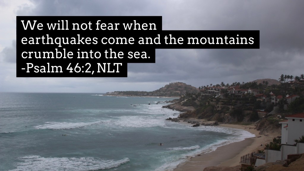 We will not fear when earthquakes come and the mountains crumble into the sea. Let the oceans roar and foam. Let the mountains tremble as the waters surge. Psalm 46:2-3, NLT